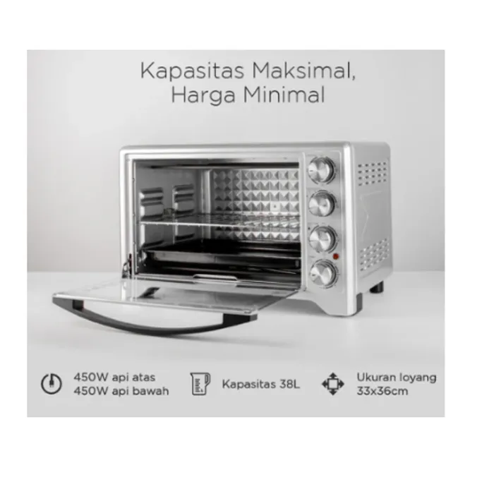 Electric Oven Platinum adalah oven yang dilengkapi teknologi diamond cavity yang dapat memanggang lebih merata. Desain dinamis warna silver dan pearl white yang elegan dan kapasitas yang besar. Dilengkapi dengan convention (kipas) lampu dan rotiseries untuk memanggang ayam, diamond surface heat reflector dan 4 heating element (4 elemen panas stainless steel), serta suhu yang bisa diatur 100-250°C, timer untuk waktu lama memanggang dan bell ring jika sudah selesai. Memiliki daya 220 V ~ 50 / 450 Watt - 900 Watt. Terdapat pengaturan untuk api atas saja (450 W), api bawah saja(450 W) ataupun api atas bawah bersamaan (900 W). Mudah dibersihkan dan digunakan. Kapasitas 38 Liter dengan ruang memanggang lebih besar.