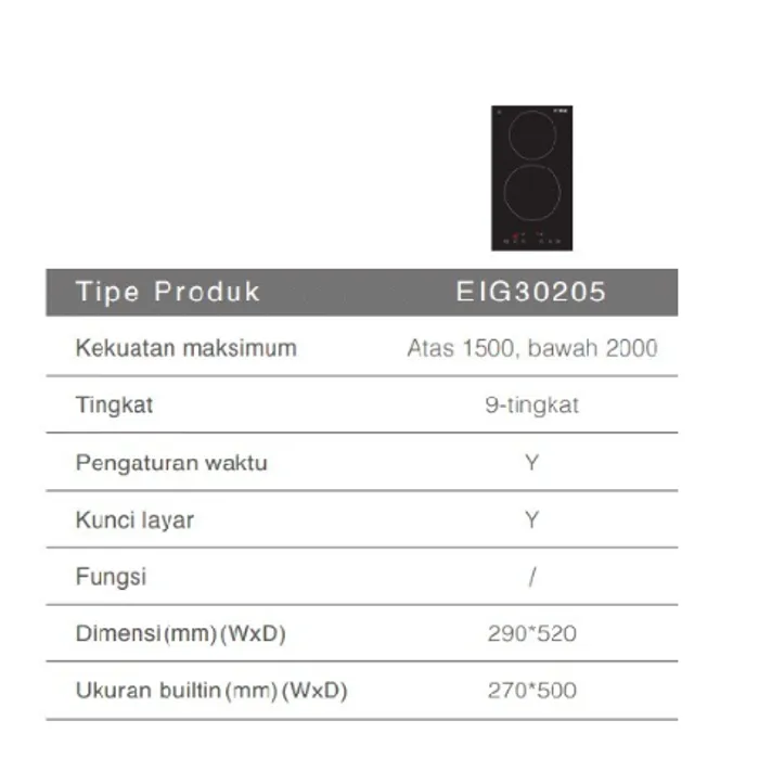Fotile Induction Hob EIG30205 merupakan seri terbaru untuk kompor induksi Fotile, dengan design yang mewah dan premium. Dilengkapi dengan 9 Level Heat Power, Heat Indicator System, Ceramic-glass panel, Automatic Shut-off System, Child Lock Function, dan Touch Control.