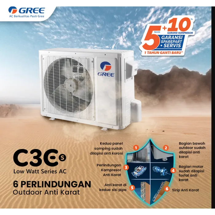 AC Gree C3E(S) Deluxe Low Watt miliki keunggulan 4 EKSTRA; yaitu Ekstra Hemat, Ekstra Awet (Menggunakan perlindungan anti karat), Perlindungan Ekstra, Ekstra Aman. Di tambah teknologi “Pengingat Pintar”, yaitu kemampuan mengingat seluruh pengaturan pada remote mulai dari suhu, kecepatan kipas, jam, dan mode lainnya, ketika menyala kembali setelah listrik padam. AC hemat energi terbaru yang menggunakan Freon R32 ramah lingkungan dan 4 Protection yaitu; Anti Api, Anti Bocor, Anti tegangan tinggi, Anti korsleting dan AC Series ini sudah dilengkapi dengan Filter DIY dimana kita bebas memilih fungsi filter sesuai dengan kebutuhan pengguna. Filter yang tersedia ( Filter Pembersih Tungau, Filter Antiseptik, Filter Penghilang Bau dengan Nano Fotokatalis, Filter Antibakteri Penghilang Formalin, Filter Alami Antibakteri, Filter Vitamin C Anti Biosida). Outdoor AC GREE telah mendapatkan sertifikasi RoHS, QC Pass, dan CCC.