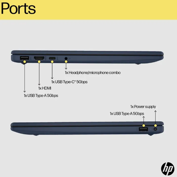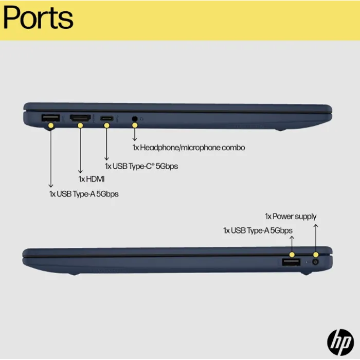 1 USB Type-C® 5Gbps signaling rate (supports data transfer only and does not support charging or external monitors); 2 USB Type-A 5Gbps signaling rate; 1 AC smart pin; 1 HDMI 1.4b; 1 headphone/microphone combo