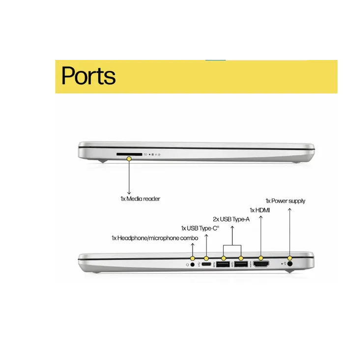 1 USB Type-C® 5Gbps signaling rate (supports data transfer only and does not support charging or external monitors); 2 USB Type-A 5Gbps signaling rate; 1 AC smart pin; 1 HDMI 1.4b; 1 headphone/microphone combo