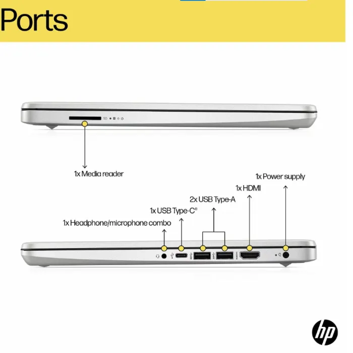1 USB Type-C® 5Gbps signaling rate (supports data transfer only and does not support charging or external monitors); 2 USB Type-A 5Gbps signaling rate; 1 AC smart pin; 1 HDMI 1.4b; 1 headphone/microphone combo