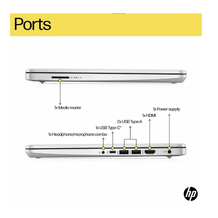 1 USB Type-C® 5Gbps signaling rate (supports data transfer only and does not support charging or external monitors); 2 USB Type-A 5Gbps signaling rate; 1 AC smart pin; 1 HDMI 1.4b; 1 headphone/microphone combo