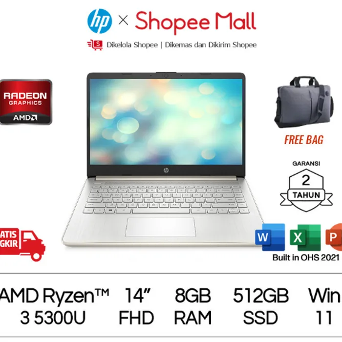 Spesifikasi nama panjang produk HP Laptop 14s-fq1011AU, Windows 11 Home Single Language, 14", AMD Ryzen™ 3, GB 512GB SSD, FHD, Pale gold