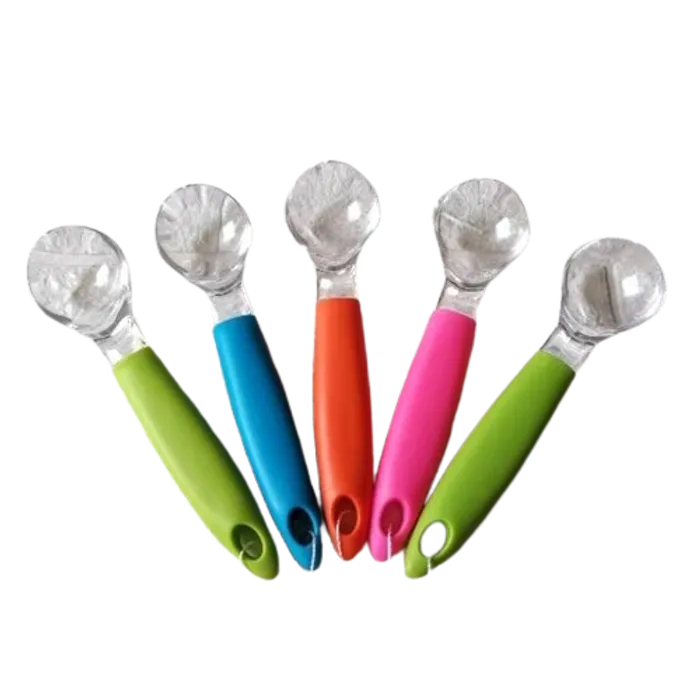 Sendok es krim dengan gagang warna, yang menarik. Ice cream scoop atau sendok yang berguna untuk menyendok es krim agar membulat, sehingga es krim tampil cantik ketika dihidangkan, berbahan plastik PP Food grade yang aman untuk makanan. Gagang berwarna warna-warni.