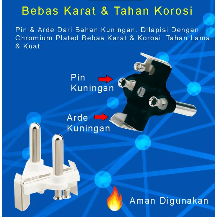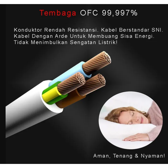 Kabel berkualitas tinggi 1.5M atau 3M dengan menggunakan Standard Nasional Indonesia 3 X 0.75mm2 + steker arde insulasi berkualitas SNI.