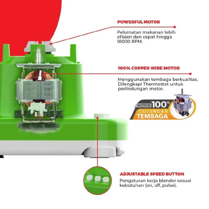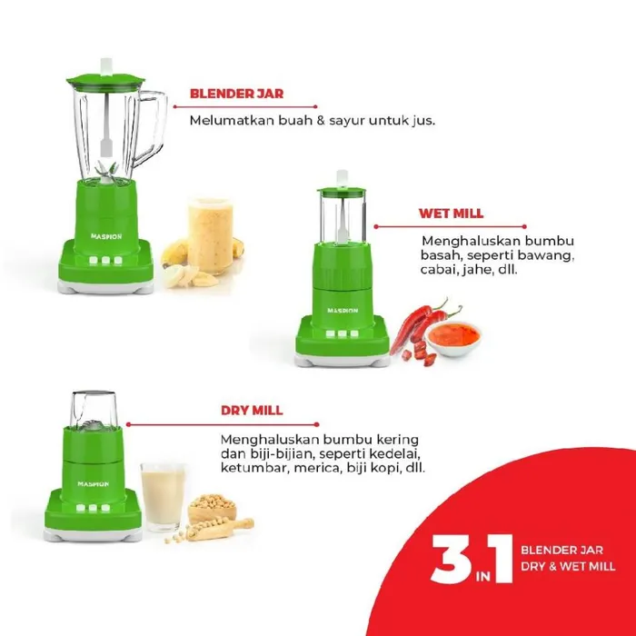 | Kapasitas | 1 L (Blender), 50gr (Dry Mill), 100gr (Wet Mill) |