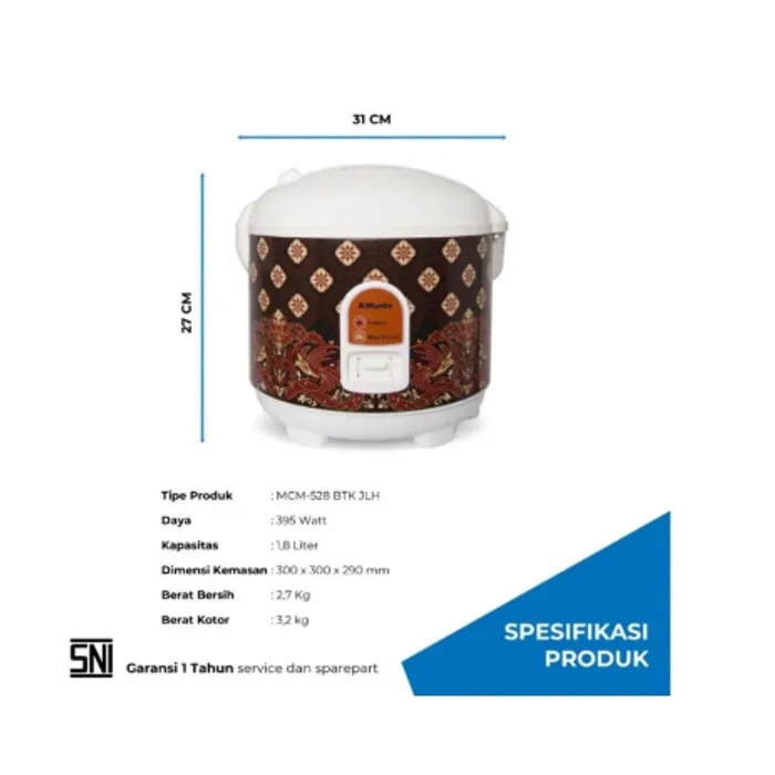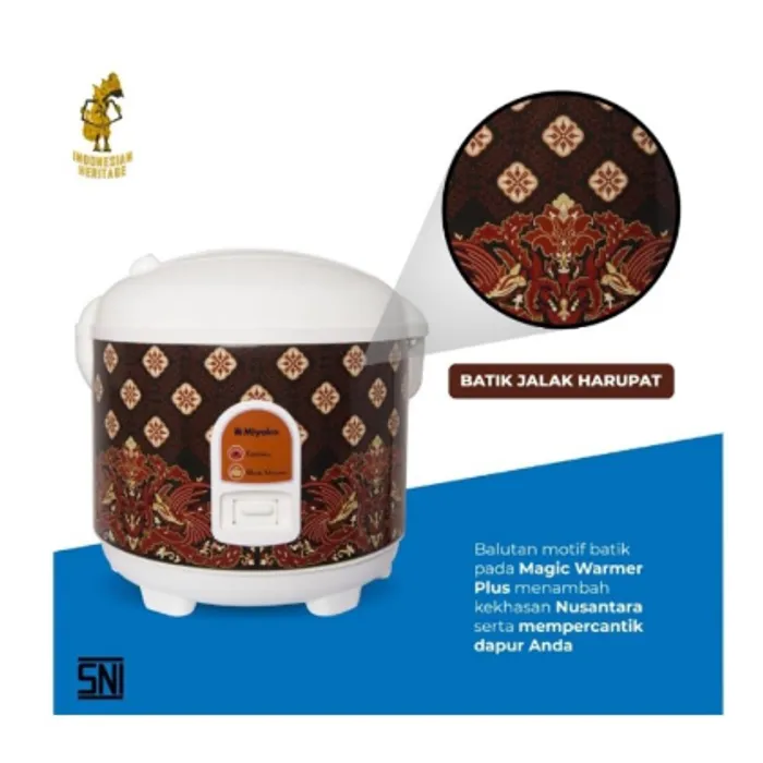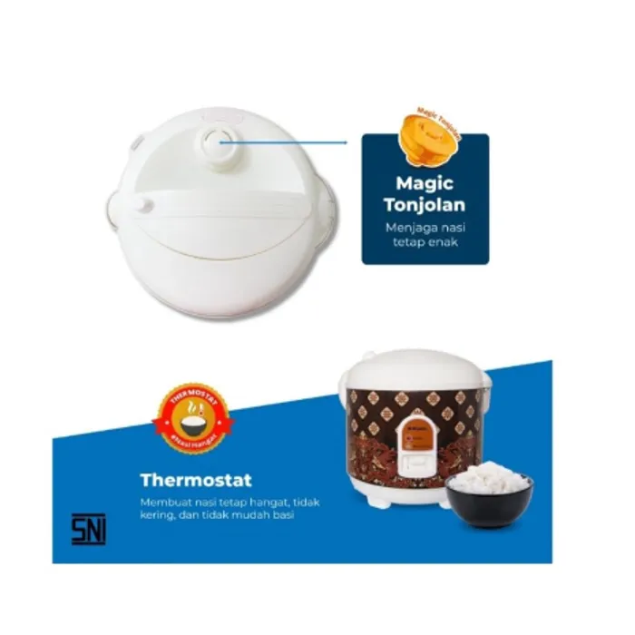 Merupakan penanak nasi dengan motif batik cantik Khas Indonesia. Tipe ini memiliki corak batik jalak harupat yang akan mempercantik dapur Anda. Memiliki fungsi 3 in 1 yaitu sebagai pemasak nasi, mengukus, dan menghangatkan makanan. Bagian inner pot yang terbuat dari material berkualitas tinggi menjadikannya anti lengket, tidak mudah tergores dan sangat mudah untuk dibersihkan. Memiliki 3 element pemanas dibagian atas, tengah dan bawah yang menjadikan nasi matang lebih sempurna dan tahan hangat lebih lama.