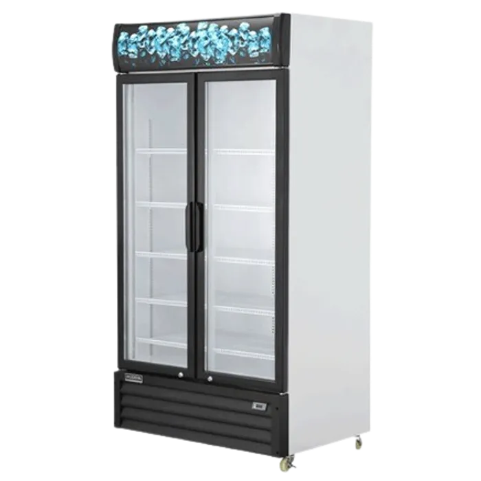 Showcase cooler dengan kaca dua lapis, penguapan otomatis, udara anti embun, dan kompresor heavy duty.