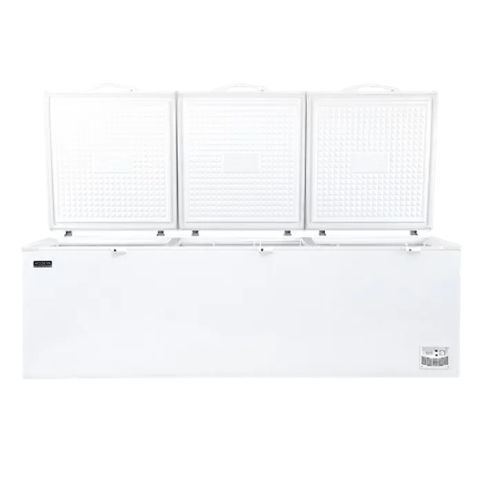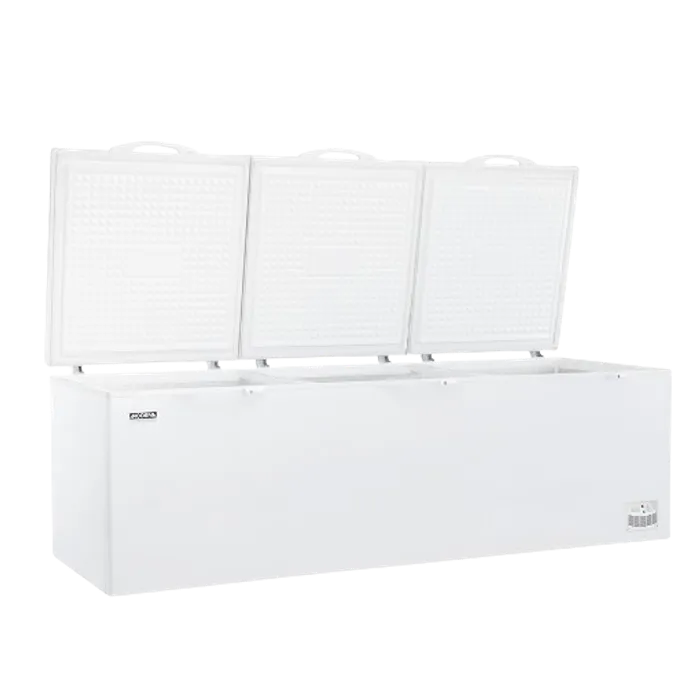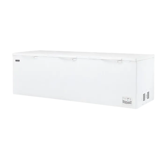 Chest freezer heavy duty dengan Power Duo Cooling, lapisan aluminium, lubang pembuangan udara, pintu yang dapat dikunci, dan keranjang yang kuat.
