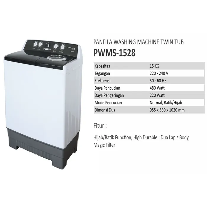 PWMS-1528 adalah mesin cuci twin tub dengan kapasitas 15 Kg yang dapat mencuci lebih bersih, dengan putaran pulsator yang kuat dan distribusi air yang merata memastikan mencuci lebih bersih. Selain pulsator ada beberapa fitur yang lain diantaranya sebagai berikut :