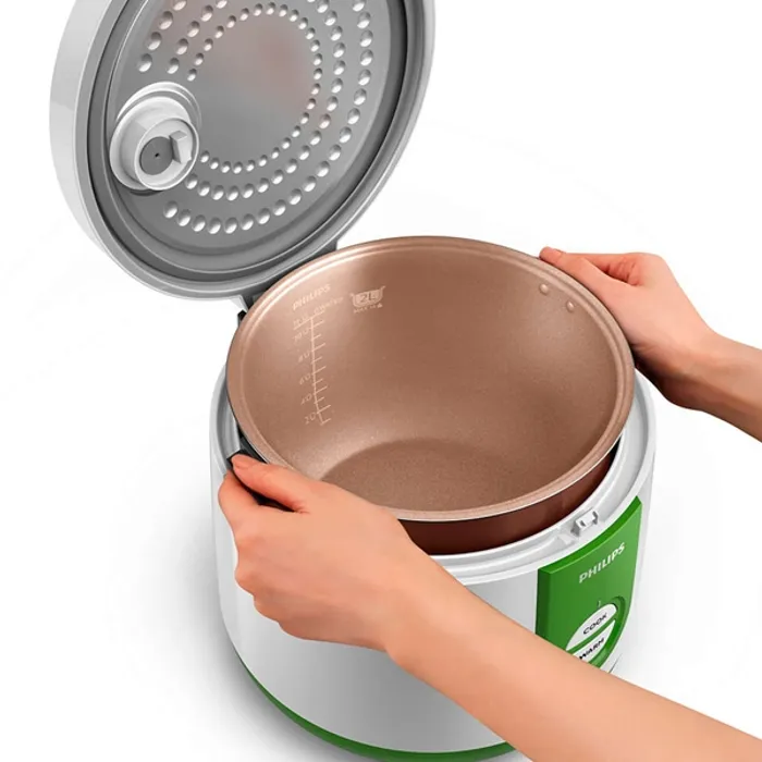 Extra Thick Alloy pada magic com Philips : Memberikan panas yang merata dan memastikan setiap bulir beras direbus dan dimasak secara merata, dan memberikan anda tekstur yang diinginkan