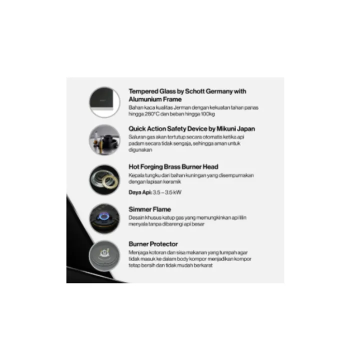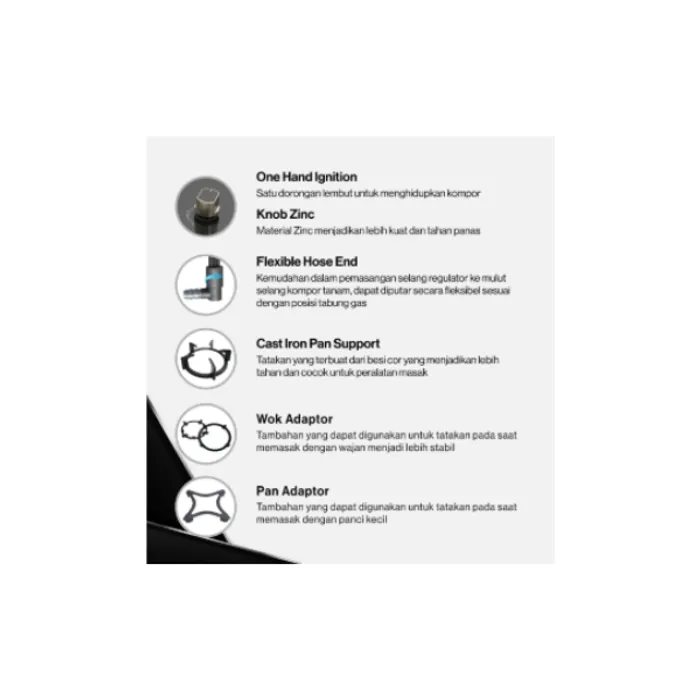additional description Quick Action Safety Device, Hot Forging Brass Burner Head, Alumunium Die Cast Burner Body, Simmer Flame, Cast Iron Pan Support, Wok & Pan Adaptor