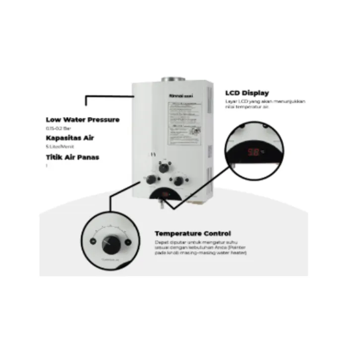 Water Heater Rinnai REU-5CFC dengan fitur direct shower yang menghasilkan air hangat secara langsung tanpa harus dicampur dengan air dingin. Memiliki berbagai fitur seperti anti kebocoran gas, anti over heating, anti tekanan berlebih dan safety timer. Nikmati relaksasi setelah beraktivitas seharian dengan mandi air hangat menggunakan Rinnai Water Heater REU-5CFC.