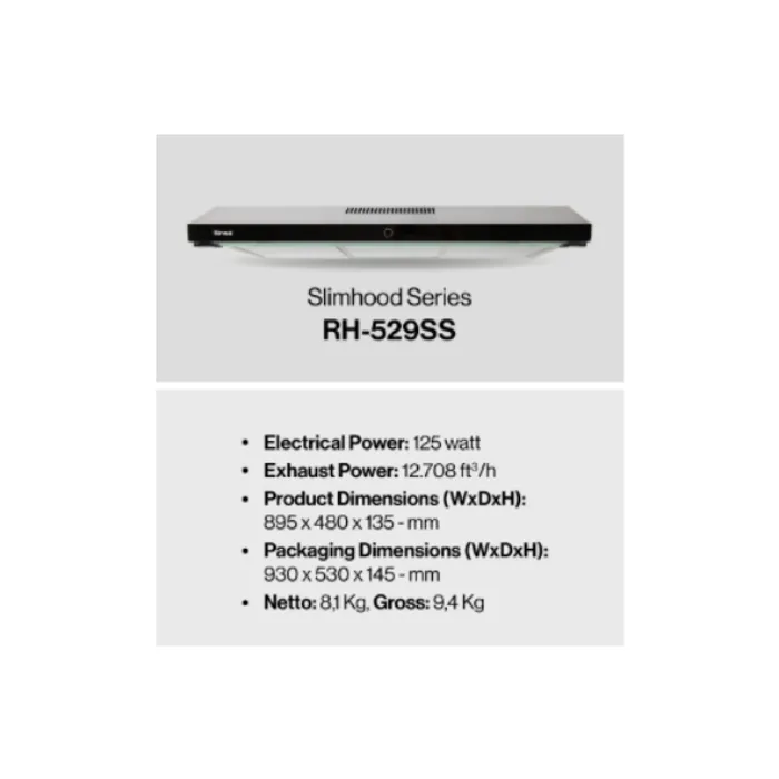 Dapur bebas asap dan lebih nyaman. RH-529SS merupakan cooker hood atau alat penghisap asap dengan visor pengarah asap dan bahan stainles steel mewah untuk Anda yang memiliki dapur modern dan minimalis. Cooker hood ini memiliki fitur double exhaust system yang bisa diatur dan disesuaikan dengan kebutuh dapur Anda bisa recycle ataupun ventilation. Selain itu terdapat 2 charcoal filter yaitu filter penyaring bau yang mudah untuk dibersihkan dan dipasang kembali.