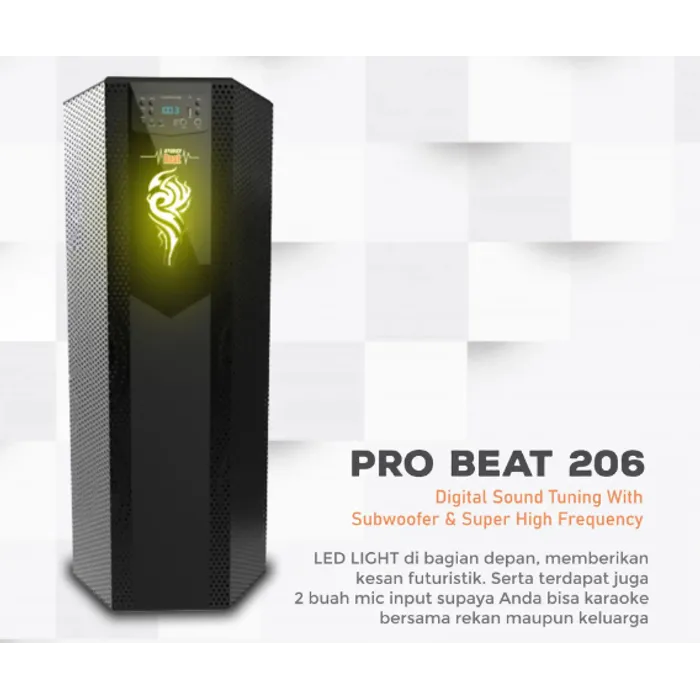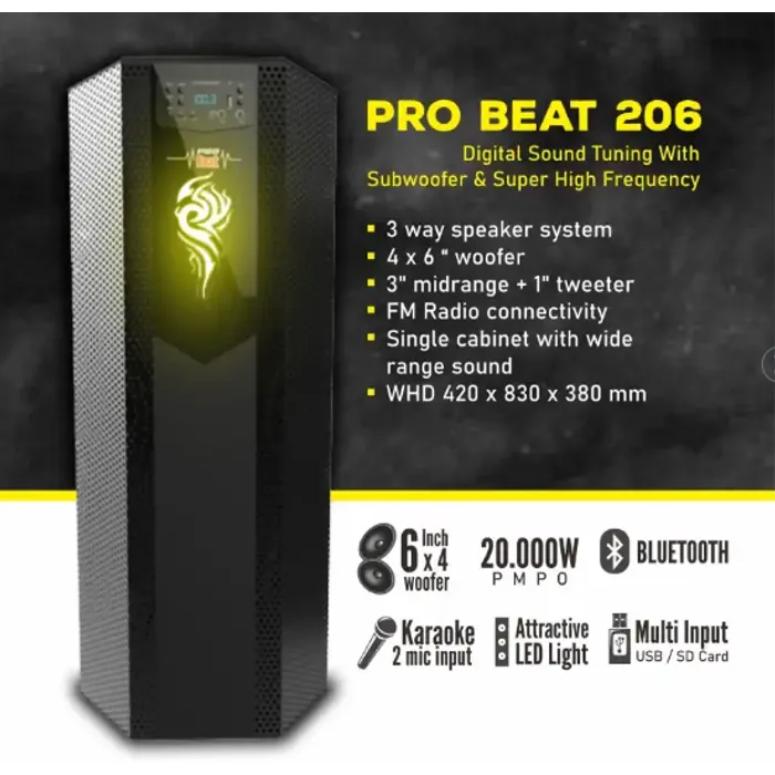 Speaker Aktif Roadmaster PRO Beat 206 dengan 4 Woofer 6" ini memiliki suara yang sangat bagus dan dashyat, menghasilkan suara musik dengan power yang sangat kuat sekali, juga dilengkapi dengan Light Colourful LED.