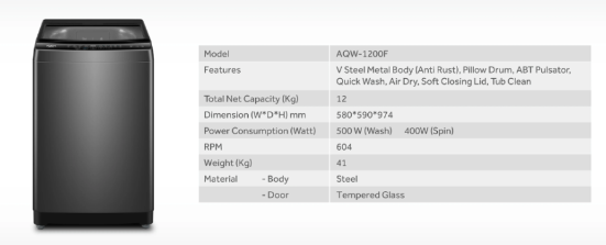 Features : V Steel Metal Body (Anti Rust), Pillow Drum, ABT Pulsator, Quick Wash, Air Dry, Soft Closing Lid, Tub Clean