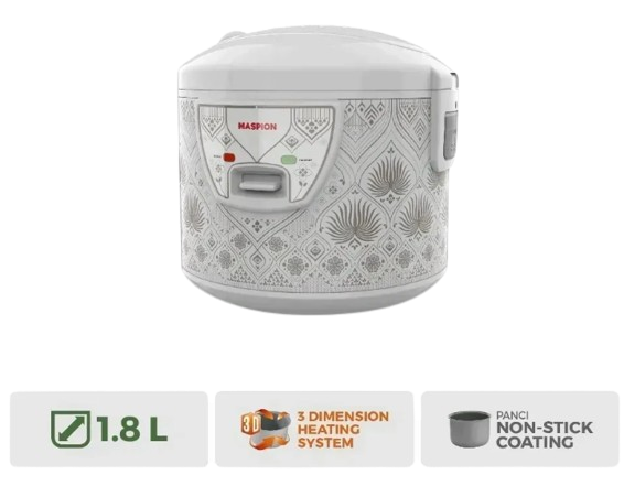Specification : - Capacity : 1.8 L - Pan : Non-stick Coating - Body : Plate - Function : Rice Cooker, Warmer, Steamer - Wattage : 395 W - Voltage : 220 V ~ 50 Hz - Inner Box : 305 x 305 x 283 mm - Outer Box (4 pcs) : 620 x 620 x 293 mm - Product Weight : 3,1 kg - Product Dimension : 300 x T.245 mm