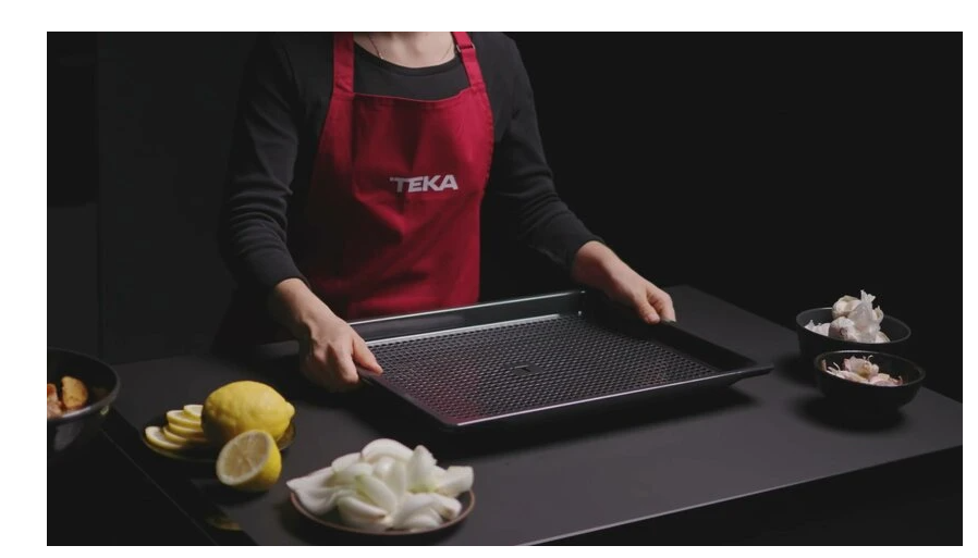 Oven AirFry Teka memiliki nampan berlubang khusus, yang memungkinkan sirkulasi udara yang sempurna, sehingga makanan memasak secara merata dan tanpa harus membalikan makanan.